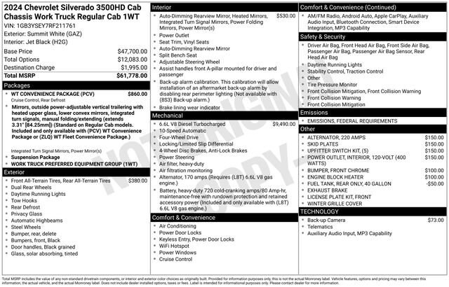 Summit White 2024 Chevrolet Silverado 3500HD Work Truck Fleet 4WD 10-Speed Automatic Duramax 6.6L V8 Turbodiesel 10-Speed Automatic, 4WD, Jet Black Vinyl. Price includes $17,462 in dealer added accessories.