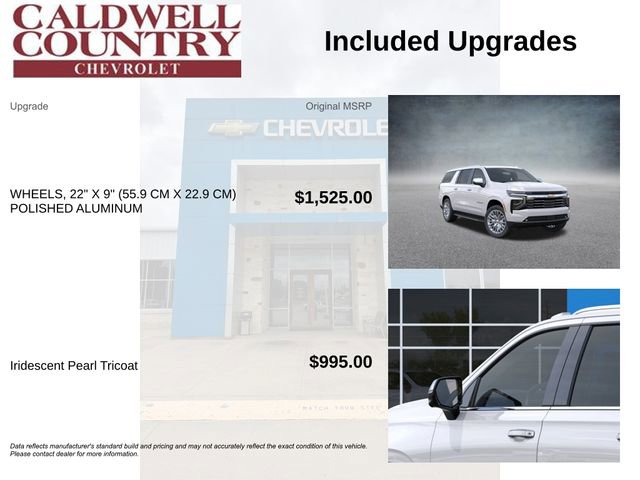 Iridescent Pearl Tricoat 2025 Chevrolet Suburban Premier 4WD 10-Speed Automatic with Overdrive EcoTec3 5.3L V8 Price includes the following incentives, see dealer for details. : $1000 - Chevrolet Consumer Cash Program. Exp. 03/02/2026