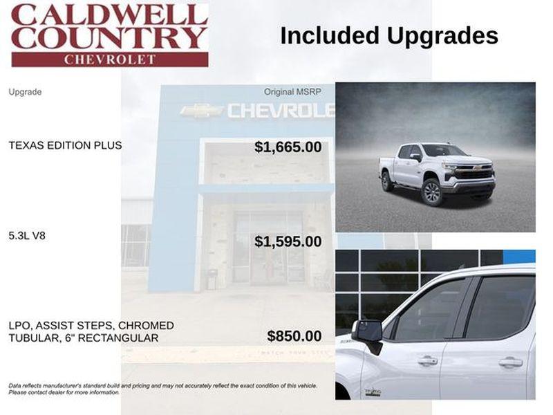 Summit White 2026 Chevrolet Silverado 1500 LT Texas Edition RWD 10-Speed Automatic EcoTec3 5.3L V8 10-Speed Automatic, Black Cloth. Price includes the following incentives, see dealer for details. : $1000 - Chevrolet Select Market Bonus Cash. Exp. 03/31/2026 $1500 - Chevrolet Bonus Cash. Exp. 03/31/2026 $3250 - Chevrolet Consumer Cash Program. Exp. 03/31/2026