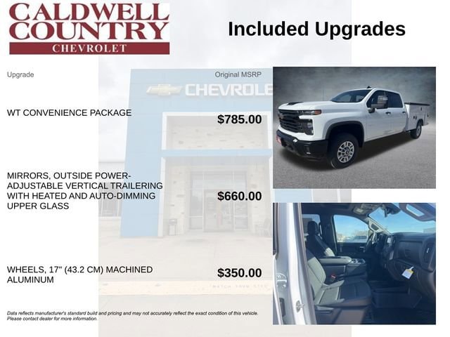 Summit White 2026 Chevrolet Silverado 2500HD Work Truck 4WD 10-Speed Automatic 6.6L V8 10-Speed Automatic, 4WD, Jet Black Vinyl. Price includes the following incentives, see dealer for details. : $500 - Chevrolet Consumer Cash Program. Exp. 03/31/2026 Price includes $15,006 in dealer added accessories.