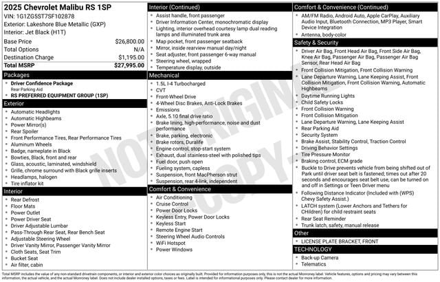 Whether you're in the market for a daily commuter or a versatile family sedan, the 2025 Chevrolet Malibu RS is a compelling choice that delivers on style, performance, and value. We invite you to experience the exceptional qualities of this Malibu RS for yourself. Schedule a test drive today and discover why this midsize sedan should be at the top of your consideration list.
